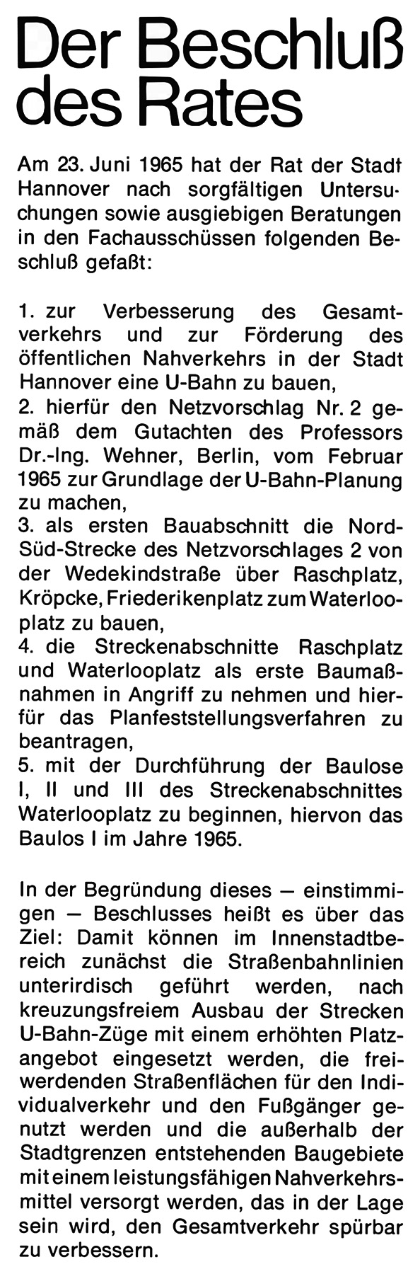 50 Jahre nach dem Beschluss ist ebenfalls festzustellen, dass das innerstädtische Stadtbahnnetz seit 1993 (mit der Eröffnung der C-Nord Richtung Nordhafen) nur zu drei Vierteln fertiggestellt bleibt. Im Ratsbeschluss wurde der „Netzvorschlag Nr. 2 gemäß dem Gutachten des Professors Dr.-Ing. Wehner, Berlin, vom Februar 1965 zur Grundlage der U-Bahn-Planung” gemacht. Ein „Netzplan 1964” mit zunächst drei Tunnelstrecken wurde aus Kapazitätsgründen – die sich zum Teil schon heute aufzeigen, siehe C-Tunnel – noch einmal überarbeitet. Dieser neue „Netzplan 1966” („Wehner-Plan”) wurde somit zur Grundlage für alle weiteren Planungen und gilt im Prinzip noch heute. Das Ergebnis war ein Tunnelnetz mit den vier Ästen A, B, C und D. Alle Streckenäste können mit nur einmaligem Umsteigen an einer der fünf Umsteigestationen Kröpcke, Hauptbahnhof, Steintor, Aegidientorplatz und Marienstraße erreicht werden.