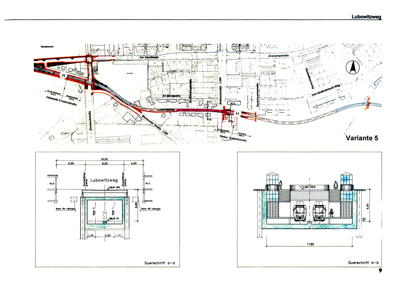 In dieser Infobroschüre, vermutlich aus dem Jahr 1998, wird der Baustellenfortschritt auf dem Baulos A 50 Brabeckstraße mit dem Tunnel Lubowitzweg und der Station Brabeckstraße gezeigt. Lagepläne, Schnitte und ein Bauzeitenplan runden die Info ab.